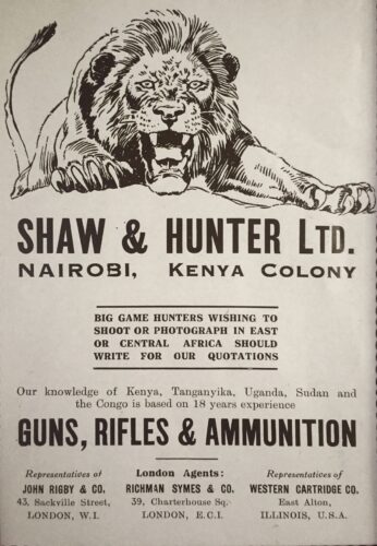 Shaw & Hunter was established in Nairobi in October 1921 and quickly became a well-known safari company based in the then Kenya Colony, a part of British East Africa.The company played a significant role in the early days of hunting tourism in East Africa. Donald Ker, a well-known East African hunter, worked for Shaw and Hunter Ltd. before starting Ker and Downey Safaris